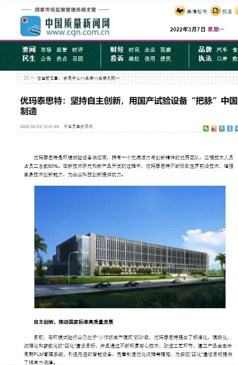 近日,中國質量新聞網發布《優瑪泰思特堅持自主創新,用國產試驗設備“把脈”中國制造》,關注水土新城優瑪泰思特自主創新。